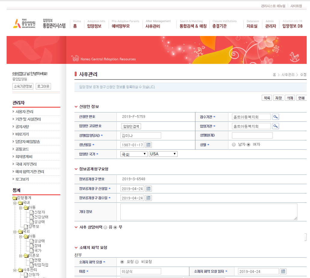 입양정보통합관리시스템 사후서비스 이력관리 구축